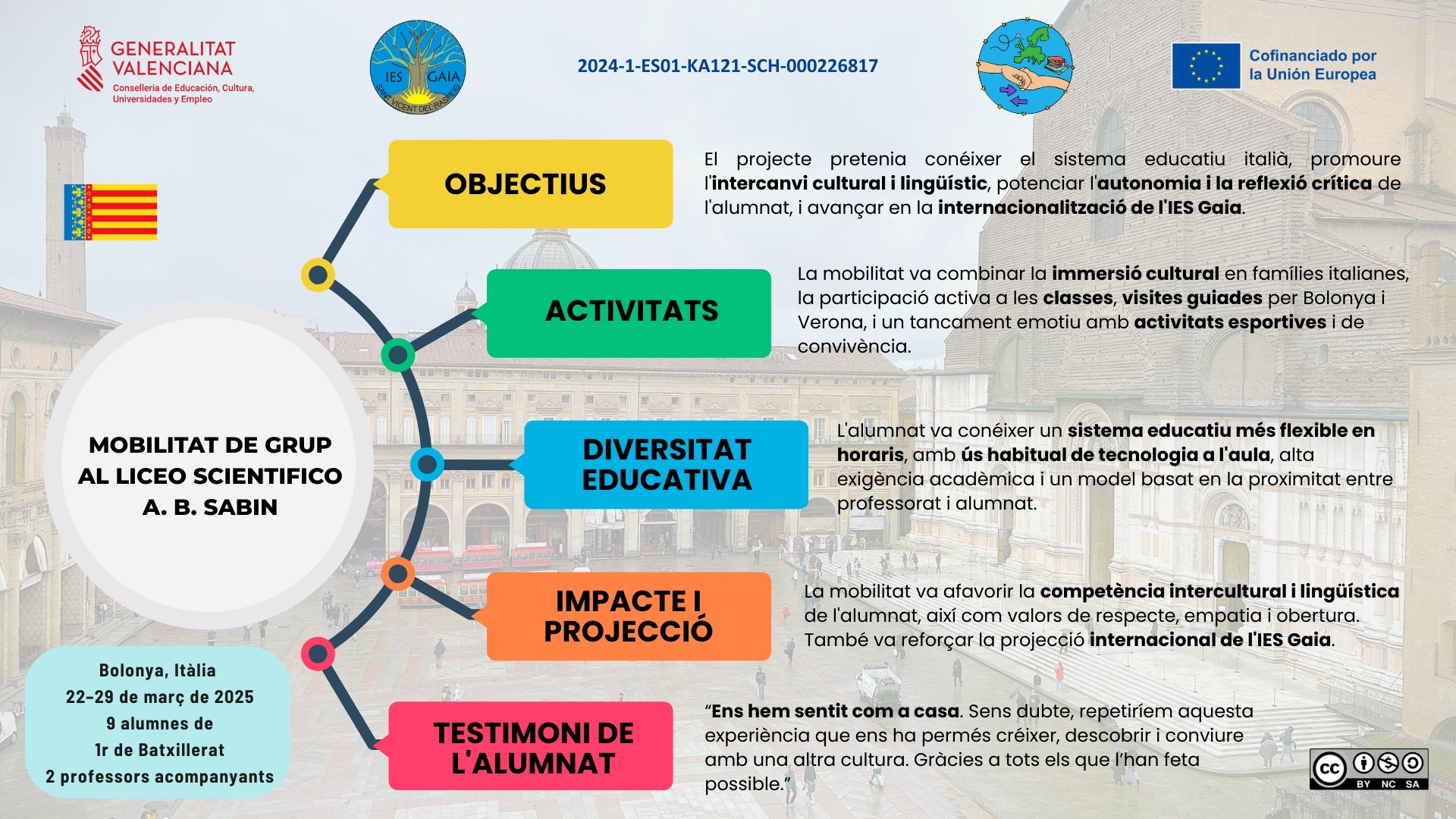 Nou alumnes de 1r de Batxillerat de l’IES Gaia van participar en una mobilitat Erasmus+ a Bolonya, Itàlia, del 22 al 29 de març de 2025. Allotjats amb famílies italianes, van assistir a classes al Liceo Sabin i van gaudir d’activitats culturals i de convivència, vivint una experiència educativa i intercultural única.
