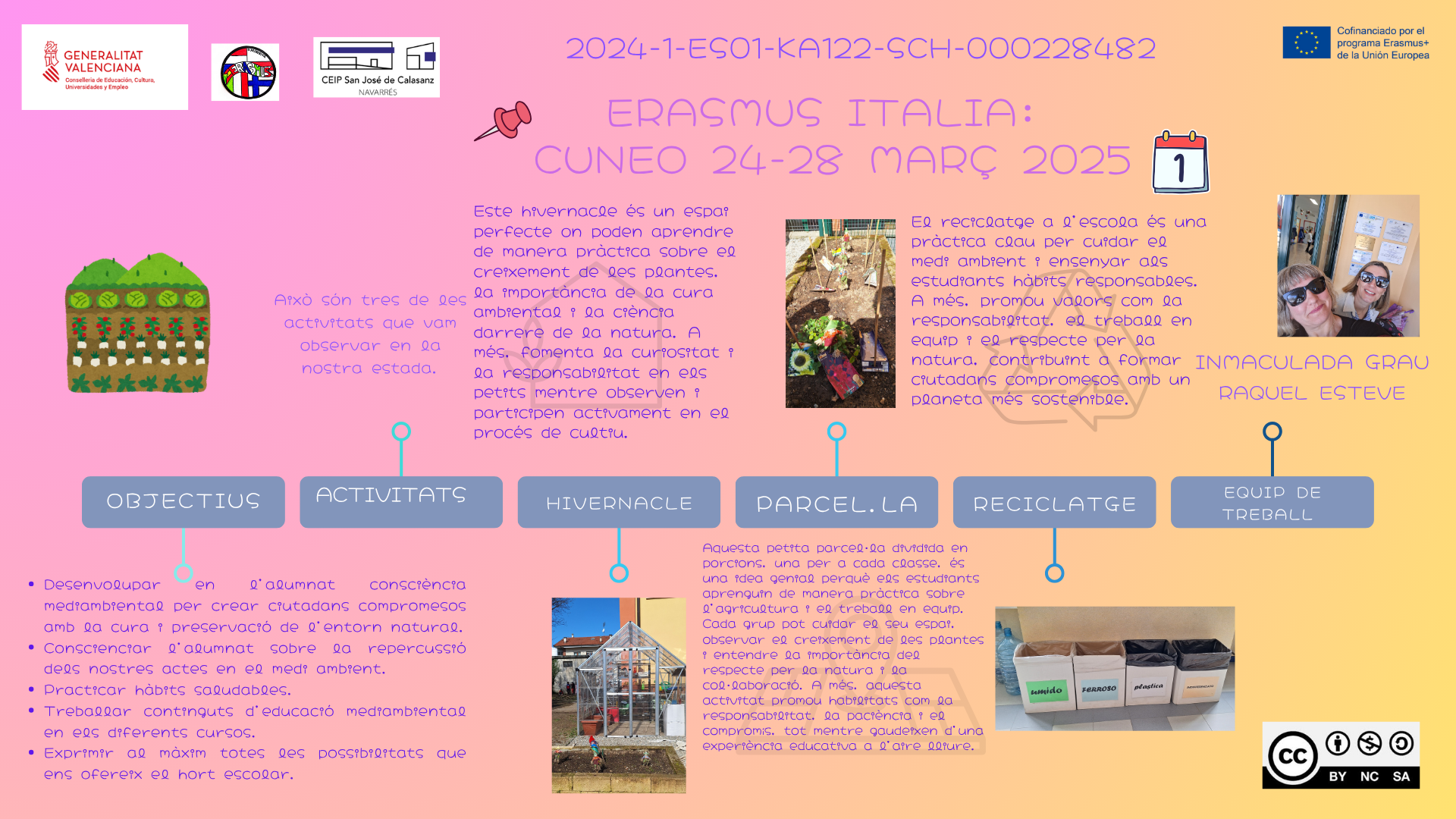 Projecte KA122 del CEIP San José de la Calasanz a Cuneo (Itàlia). Fomentar la consciència ambiental, hàbits saludables i el compromís amb l'entorn a través de l'hort escolar. Activitats com l'hivernacle, la parcel·la per classes i el reciclatge ensenyen a cuidar la naturalesa, treballar en equip i ser responsables, promovent valors i aprenentatges sostenibles en tot l'alumnat.