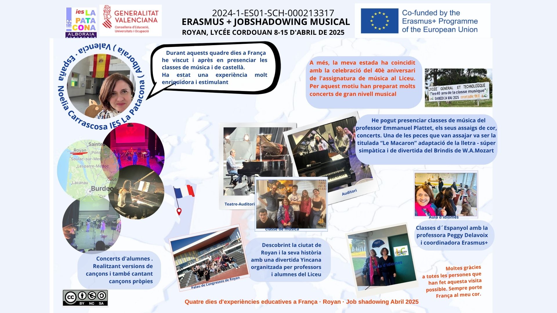 Programa Jobshadowing de l'IES La Patacona al Lycée Cordouan de Royan (França). Durant la visita, observem l'entorn creatiu del Liceu Cordouan .Vam tenir l'oportunitat de presenciar i participar en activitats diàries especialment del departament de música. Aquesta experiència ens permet compartir coneixements i enfocaments pedagògics en el camp de les arts i la cultura enfortint les relacions internacionals del nostre centre, poder de la col·laboració i el compromís de l'educació.