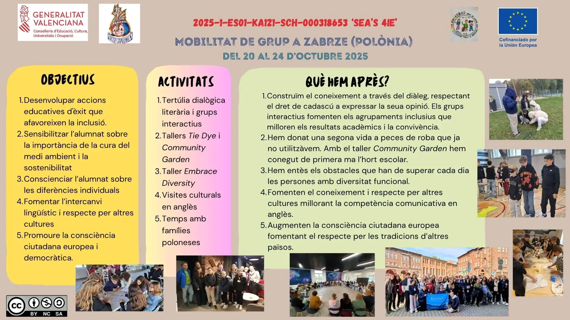 Del 20 al 24 d’octubre, 2 mestres i 8 alumnes de 6è de primària del CEIP Jaume I d’Alcàsser han participat en una mobilitat de grup a Zabrze, Polònia, en el marc del projecte SEA’S 4IE en col·laboració amb centres educatius d’Itàlia, Portugal i Polònia. Durant la setmana han participat en diferents activitats encaminades a desenvolupar accions educatives d’èxit per afavorir la inclusió. Altres objetius del projecte són: la millora de la competència comunicativa en anglès, la cura del medi ambient i sostenibilitat, la consciència i respecte cultural i social i la consciència ciutadana europea i democràtica.