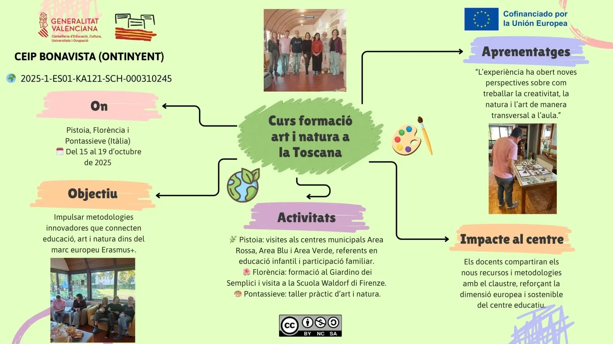Docents del CEIP Bonavista d’Ontinyent participen en una mobilitat Erasmus+ a la Toscana. Del 15 al 19 d’octubre de 2025 van assistir al curs “Art i Natura en la Toscana” amb visites a Pistoia, Florència i Pontassieve. L’experiència, centrada en metodologies que uneixen educació, art i natura, ha obert noves perspectives per fomentar la creativitat i la dimensió europea al centre.