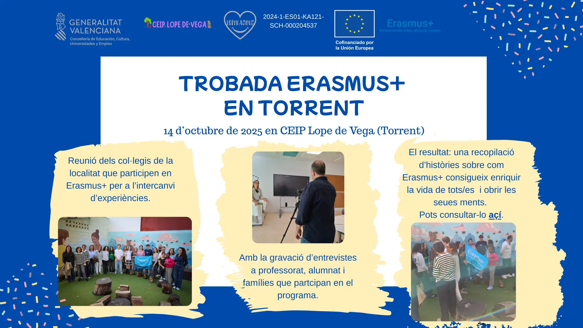Amb motiu dels Erasmus Days, el CEIP Lope de Vega ha promogut una trobada dels centres educatius de la localitat de Torrent (València) que participen en el programa Erasmus+. Durant esta trobada, a més d’intercanviar experiències sobre les diferents iniciatives Erasmus+, es van realitzar entrevistes a professorat, alumnat i famílies dels diferents col·legis. Amb totes elles, s’ha creat un vídeo promocional d’Erasmus+ que pretén ressaltar l’impacte del programa en la comunitat educativa, difondre els resultats i motivar a altres centres educatius a participar.