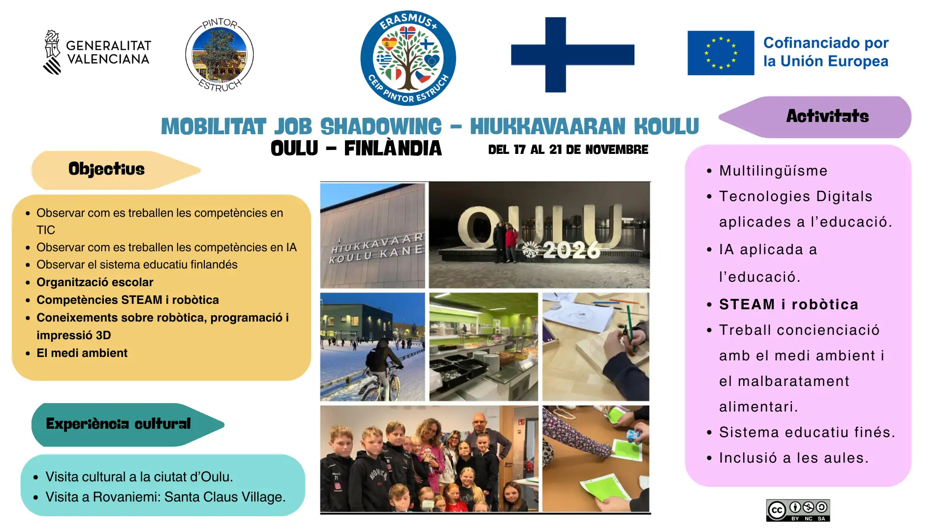 Mobilitat mitjançant Job Shadowing a Hiukavaara Skule a la ciutat d’Oulu a Finlàndia, realitzada per dos docents del CEIP Pintor Estruch de Manuel dins del programa KA-121. Durant els dies de mobilitat hem tingut l’oportunitat de poder observar en un entorn educatiu i personal immillorable els objectius del treball de les competències digitals, l’ús de l’IA en l’àmbit educatiu, STEAM i robòtica, el foment en la millora i conservació del medi ambient, així com l’organització escolar i el sistema educatiu finés.