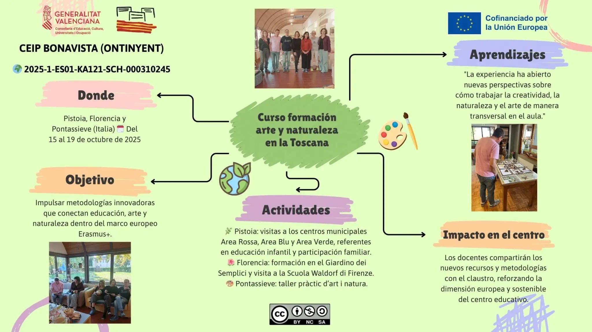 Docentes del CEIP Bonavista de Ontinyent participan en una movilidad Erasmus+ en la Toscana. Del 15 al 19 de octubre 2025 asistieron al curso “Arte y Naturaleza en la Toscana” con visitas a Pistoia, Florencia y Pontassieve. La experiencia, centrada en metodologías que unen educación, arte y naturaleza, ha abierto nuevas perspectivas para fomentar la creatividad y la dimensión europea en el centro.