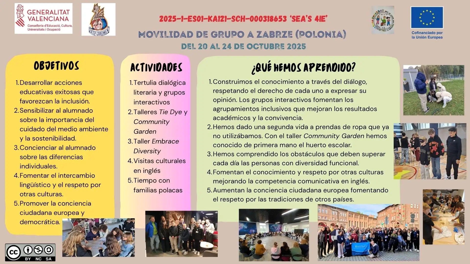 Del 20 al 24 de octubre, 2 maestras y 8 alumnos/as de 6º de primaria del CEIP Jaume I de Alcàsser han participado en una movilidad de grupo en Zabrze, Polonia, en el marco del proyecto SEA’S 4IE en colaboración con centros educativos de Italia, Portugal y Polonia. Durante la semana han participado en diferentes actividades encaminadas a desarrollar acciones educativas de éxito para favorecer la inclusión. Otros objetivos del proyecto son: la mejora de la competencia comunicativa en inglés, el cuidado del medio ambiente y la sostenibilidad, la conciencia y el respeto cultural y social, y la conciencia ciudadana europea y democrática.