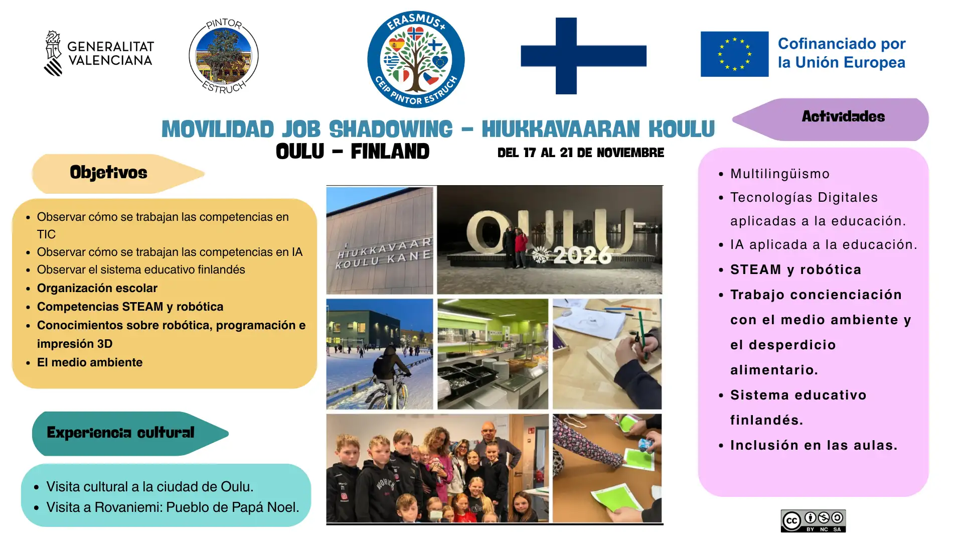 Movilidad mediante Job Shadowing a Hiukavaara Skule en la ciudad de Oulu en Finlandia, realizada por dos docentes del CEIP Pintor Estruch de Manuel dentro del programa KA-121. Durante los días de movilidad hemos tenido la oportunidad de poder observar en un entorno educativo y personal inmejorable los objetivos del trabajo de las competencias digitales, el uso del IA en el ámbito educativo, STEAM y robótica, el fomento en la mejora y conservación del medio ambiente, así como la organización escolar y el sistema educativo finlandés.