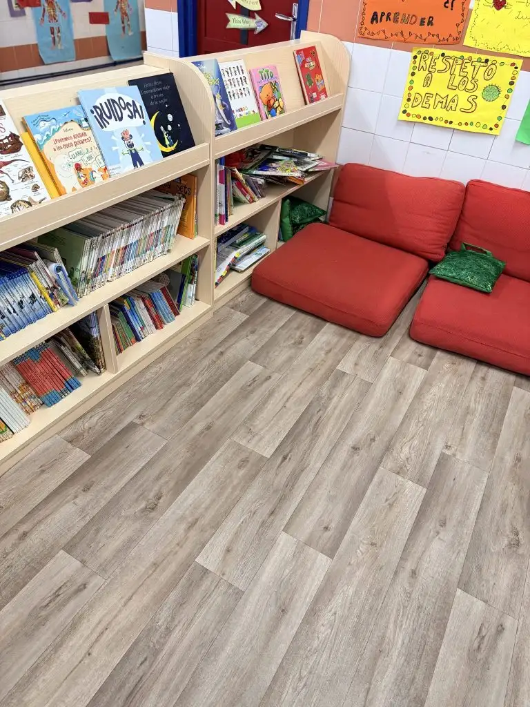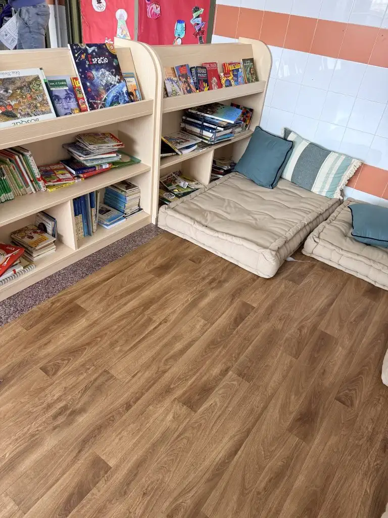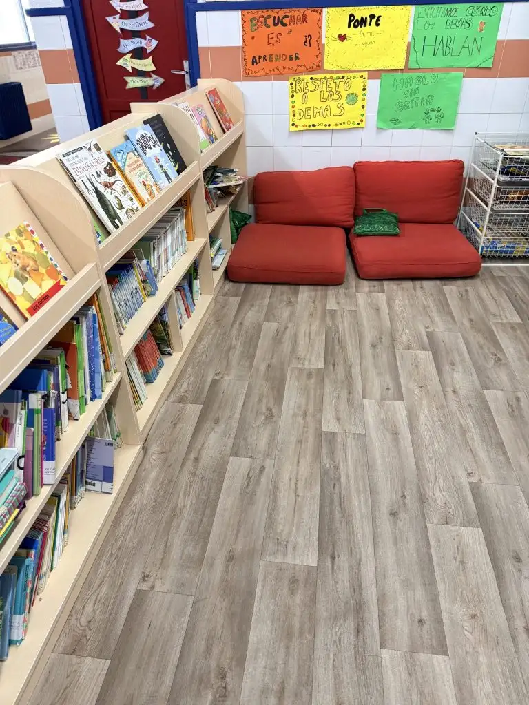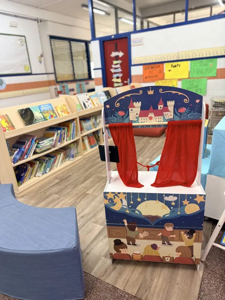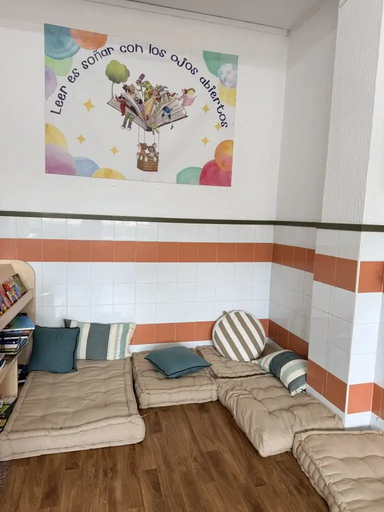 Además, como centro valoramos mucho la creación de espacios acogedores y con una neuroarquitectura accesible y que transmita calma, para invitar al alumnado a leer con tranquilidad. Por ello, contamos con una bilblioteca con cojines de suelo y libros adaptados a la edad en cada planta. En la planta baja se encuentran ejemplares ilustrados más infantiles (dirigidos a alumnado de Educación Infantil y primer ciclo de Educación Primaria), así como un teatro de marionetas que funciona como material dinamizador de los cuentacuentos. En la primera planta hallamos ejemplares adaptados a segundo y tercer ciclo de Primaria.