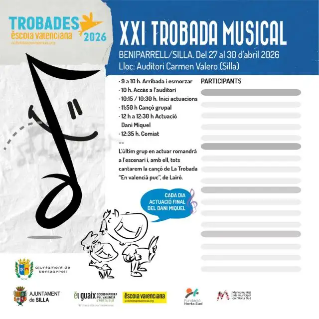 Dimarts, 23 d’abri l: el nostre centre (alumnat de quart de Primària) participarà al costat dels col·legis Bisbe Hervàs de Puçol, Carles Salvador de Benimaclet i l’institut Sanchis Guarner de Silla. Serà en el teatre Carmen Valero de Silla on ballarem diferents danses tocades amb música en directe per a l’alumnat de l’institut. Un conte creat per a l’ocasió farà de fil conductor de les danses i, en acabar, tots junts cantarem una cançó i, posteriorment, ballarem una dansa en la plaça.
