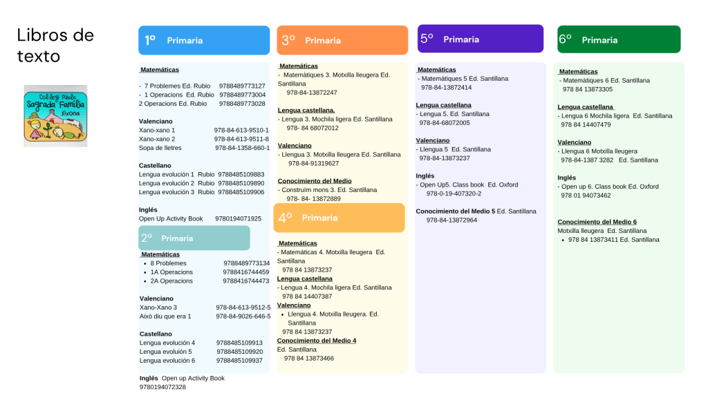 En cuanto a los alumnos de 3.º, 4.º, 5.º y 6.º; la escuela adquirirá los libros de texto correspondientes. Los alumnos se tienen que hacer cargo de tener cuidado de ellos, para que otros alumnos los puedan gastar en los cursos siguientes.