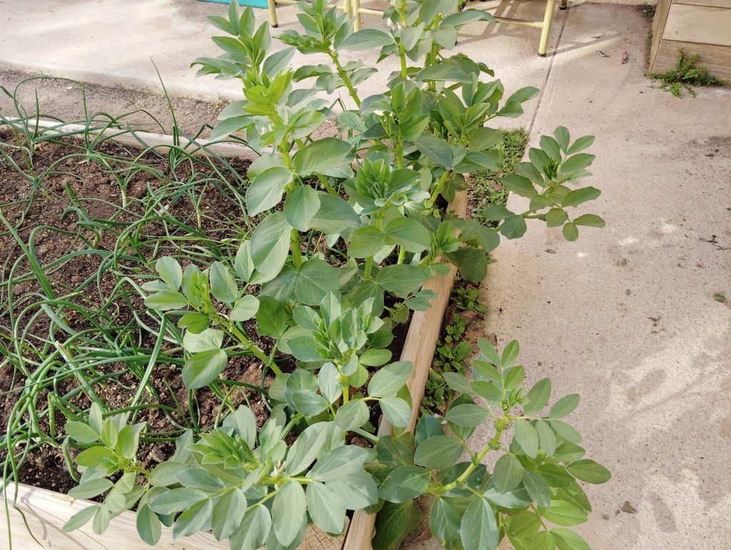 Contamos con zonas destinadas a la siembra de verduras y hortalizas de temporada, en estos momentos tenemos plantadas acelgas, cebollas, ajos y habas.