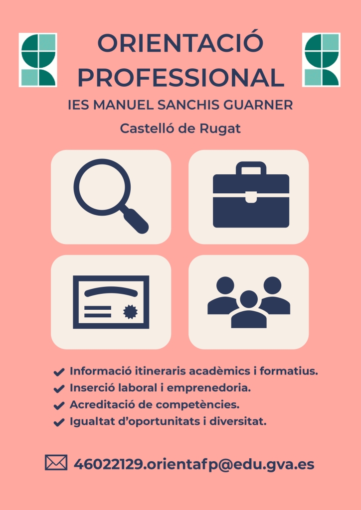 La Comissió d’Orientació Professional de l’IES Manuel Sanchis Guarner és un servei d’informació i suport en matèria acadèmica i laboral, adreçat a: