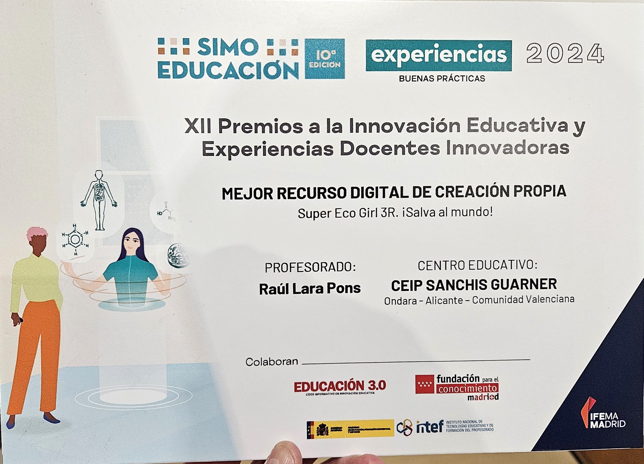 L’escola Sanchis Guarner d’Ondara ha estat guardonada el passat 20 de novembre. El projecte es va presentar i exposar en el recinte ferial d’IFEMA (Madrid) on es va celebrar SIMO Educació 2024, Saló Internacional de Tecnologia i Innovació Educativa, considerat el major esdeveniment nacional de referència tecnològica. Raül Lara, director i coordinador del projecte, va recollir el guardó com a “Millor recurs digital de creació pròpia 2024”