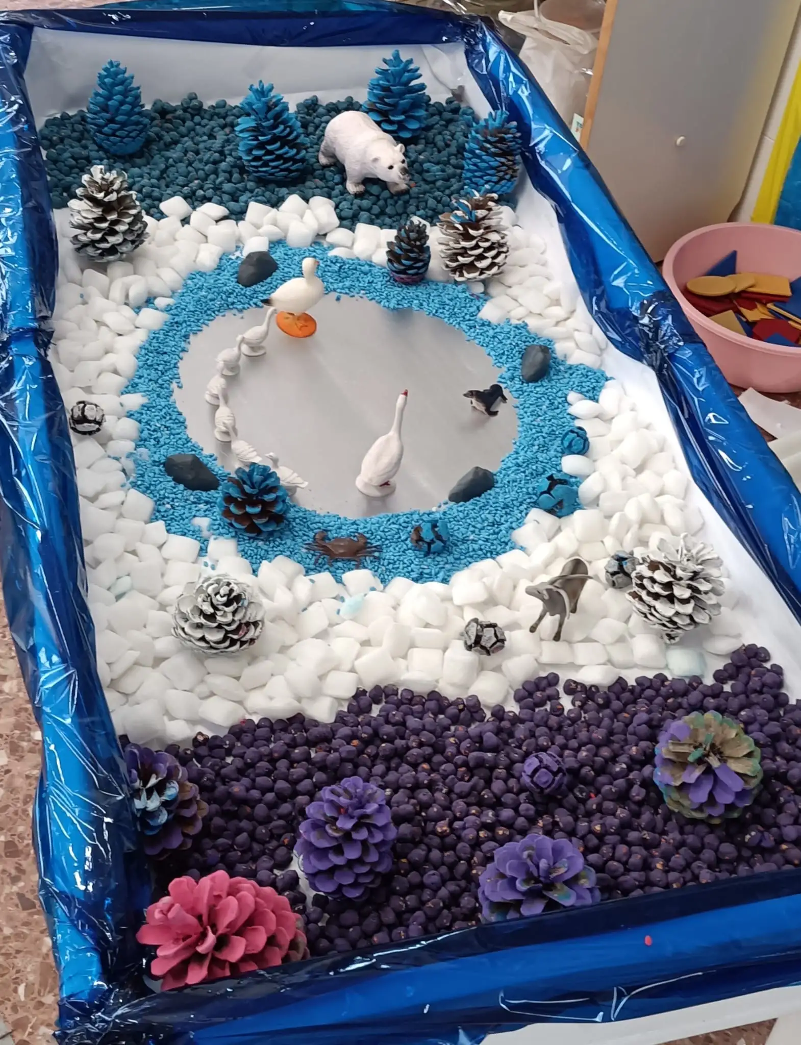 El invierno ha llegado y los peques de 3 años han pintado piñas, arroz, vasitos y garbanzos con colores del invierno. Ahora toca disfrutar y aprender jugando de los minimundos que hemos realizado entre toda la clase con mucho cariño.