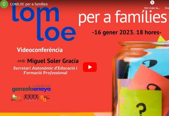 Compartimos con toda la comunidad educativa recursos creados por la confederación GONZALO ANAYA para saber más sobre la LOMLOE. Podéis ver un video con la participación del Secretario Autonómico de Educación y Formación Profesional y descargar la «GUÍA LOMLOE PARA FAMILIAS», tanto en valenciano como en castellano. ¡¡¡¡¡¡Esperamos que sea de vuestro interés!!!!!!