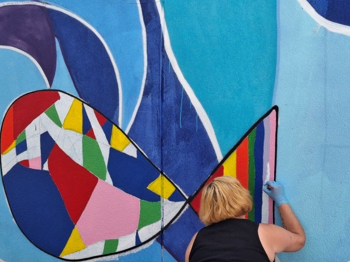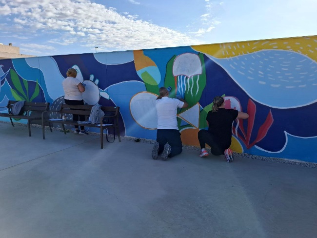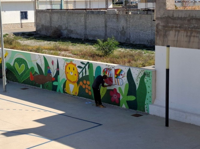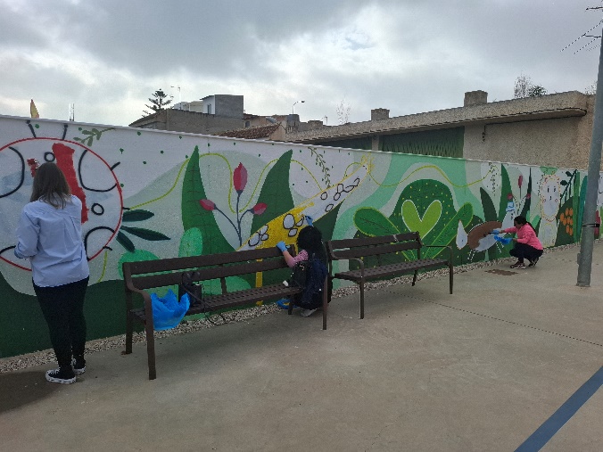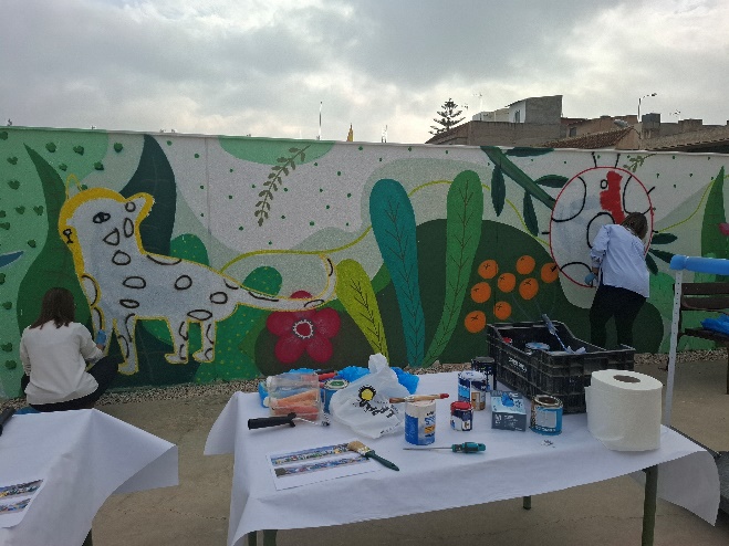 6. Pintura dels animals seleccionats al mural del pati amb la col·laboració de les famílies en la Jornada Cultural.