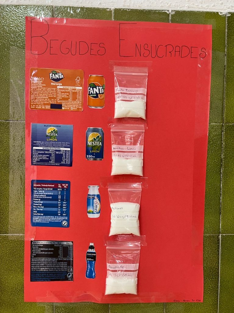 L’alumnat de 3r d’ESO, a la matèria de Biologia i Geologia, ha realitzat una activitat per analitzar la quantitat de sucre present en diverses begudes ensucrades de consum habitual. A partir de les etiquetes nutricionals, han calculat els grams de sucre i els han representat visualment amb bosses de sucre. Així, han pogut comparar marques i reflexionar sobre els seus hàbits de consum. L’objectiu és fomentar una mirada crítica i promoure decisions més saludables en la seua alimentació quotidiana.