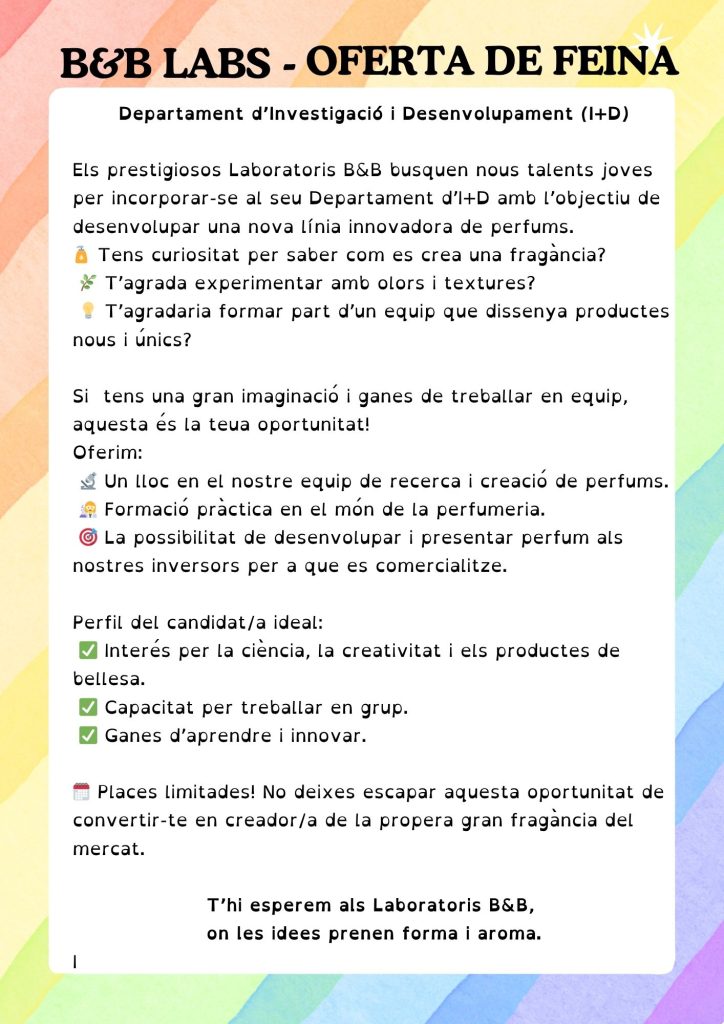 🗓 El pròxim 16 de juny celebrarem un acte final on els grups presentaran les seues propostes davant d’un comitè d’”inversors”, que valorarà quines són les fragàncies més solvents i atractives a nivell comercial.