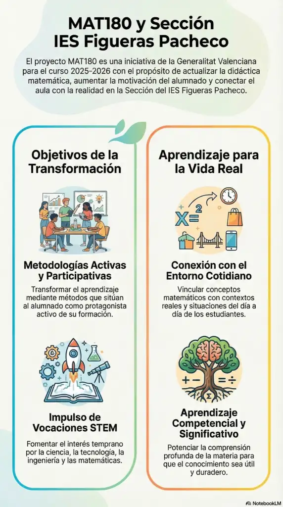 El nostre centre, la Secció de l’IES Figueras Pacheco, ha sigut seleccionat per la Conselleria d’Educació, Cultura, Universitats i Ocupació per a desenrotllar el projecte MAT180 durant el curs escolar 2025-2026.