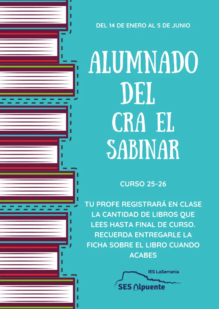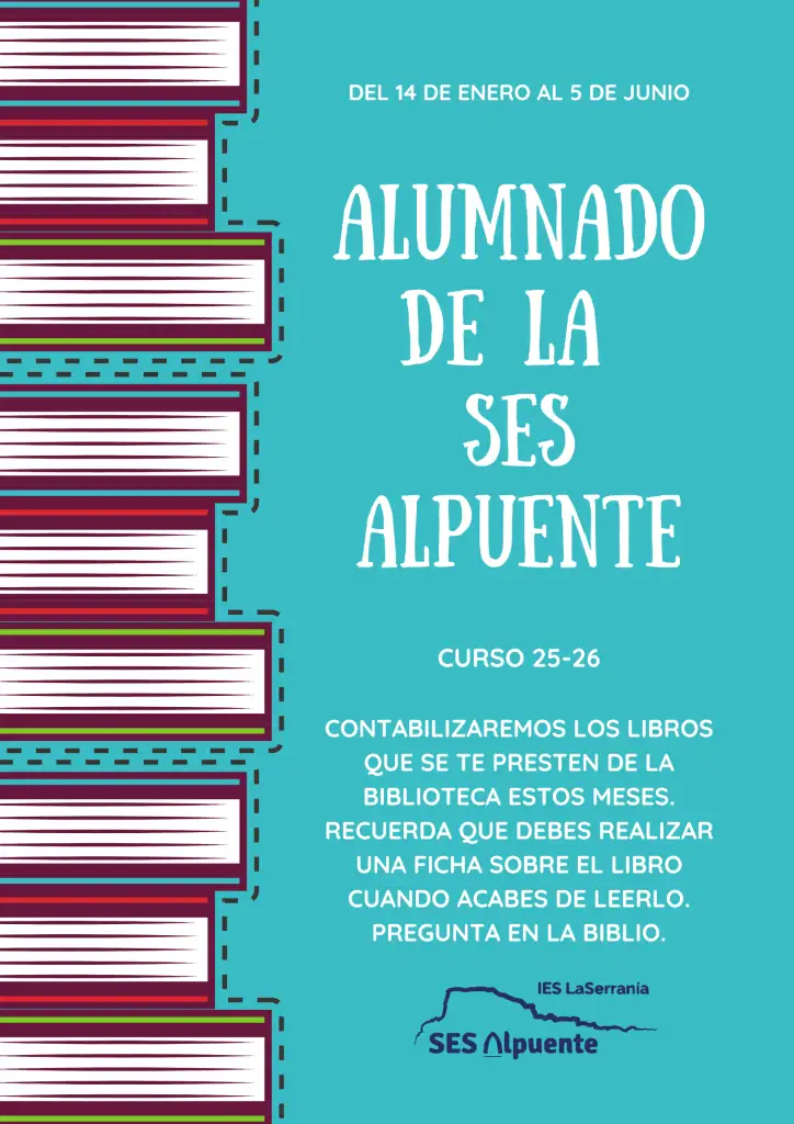 Desde la biblioteca de la SES Alpuente lanzamos un concurso para fomentar la lectura entre nuestra comunidad y el uso de nuestro servicio de préstamo bibliotecario: Concurso al mejor lector/a del curso 25-26. A final de curso reconoceremos a los usuarios de la biblioteca que más hayan leído con premios en las diferentes categorias.