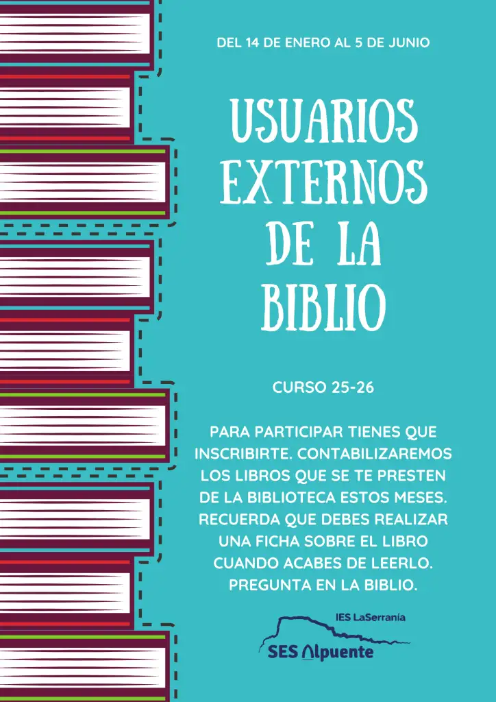 Des de la biblioteca de la SES Alpuente llancem un concurs per fomentar la lectura entre la nostra comunitat i l’ús del nostre servei de préstec bibliotecari: Concurs al millor lector/a del curs 25-26. A final de curs reconeixerem als usuaris de la biblioteca que més hagen llegit amb premis a les diferents categories.