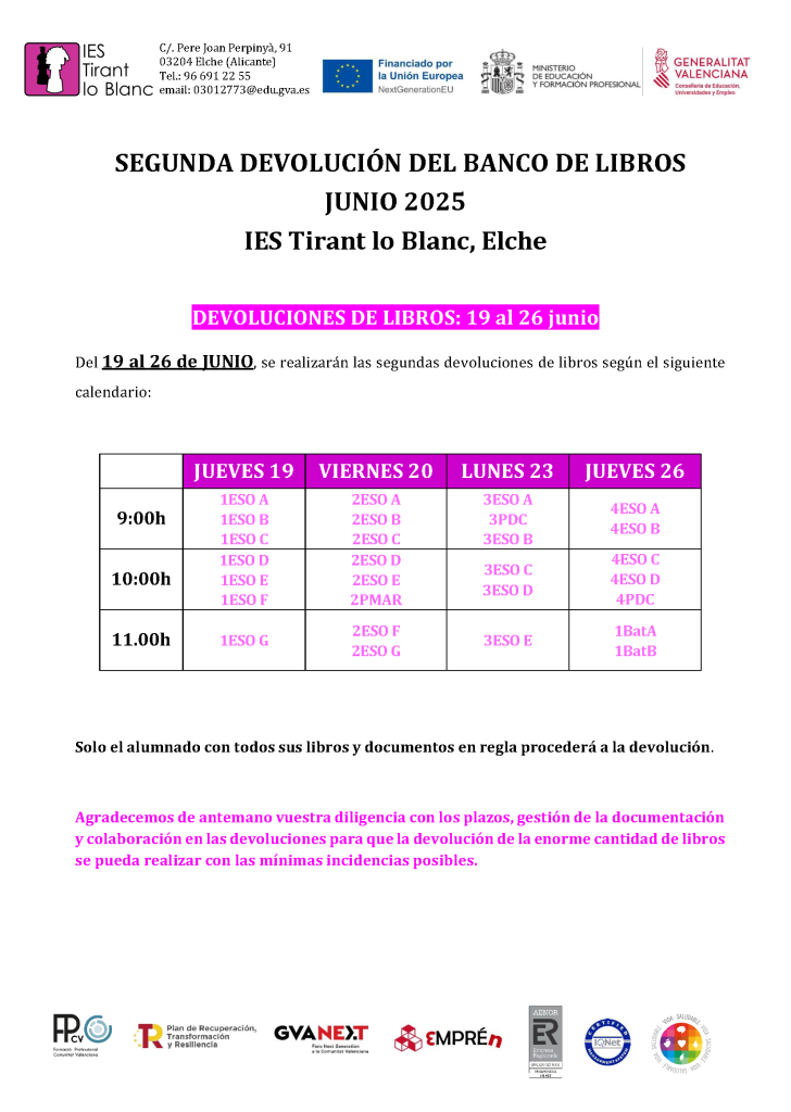 Recordad que el día 18 de junio, cuando vengáis a recoger las notas y el sobre de matrícula del curso siguiente, tendréis este mismo calendario en el vestíbulo del instituto para poder comprobar día y hora de devolución. Todas las devoluciones se realizarán en la Biblioteca.