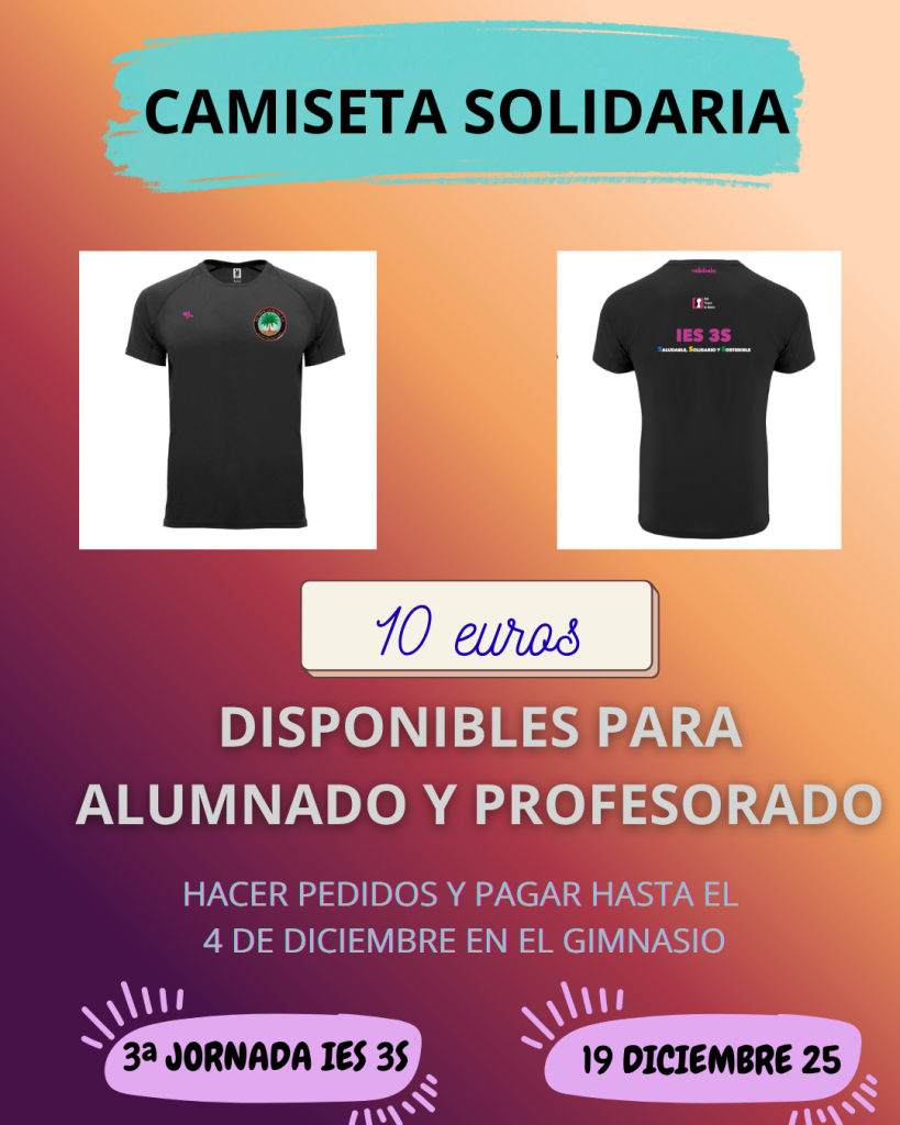 De momento, aquí os presentamos el diseño de las camisetas solidarias que hemos preparado para este año. Recordad que, como siempre, cuestan 10€ y se las podéis encargar y pagar a los profes de EF antes del 4 de diciembre.