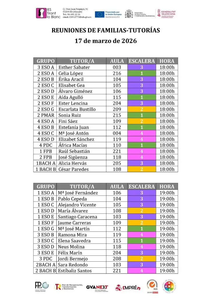 El próximo 17 de marzo tendrán lugar las reuniones de familias con tutores en dos turnos (18h y 19h). En estos calendarios podéis comprobar las horas y las aulas de las reuniones de cada grupo: