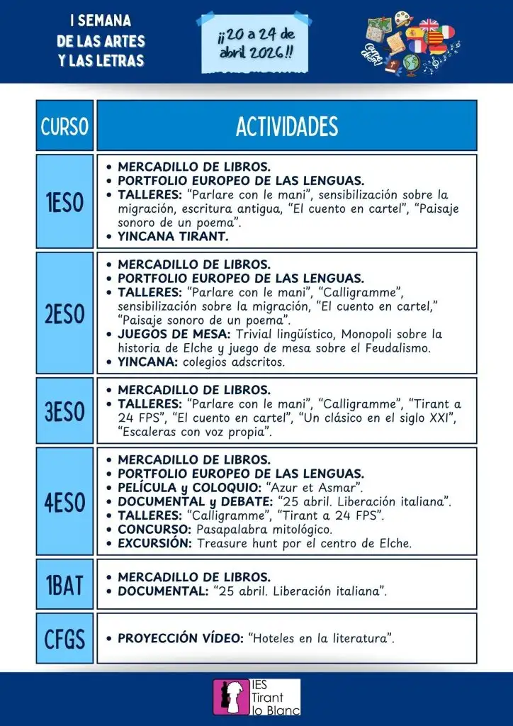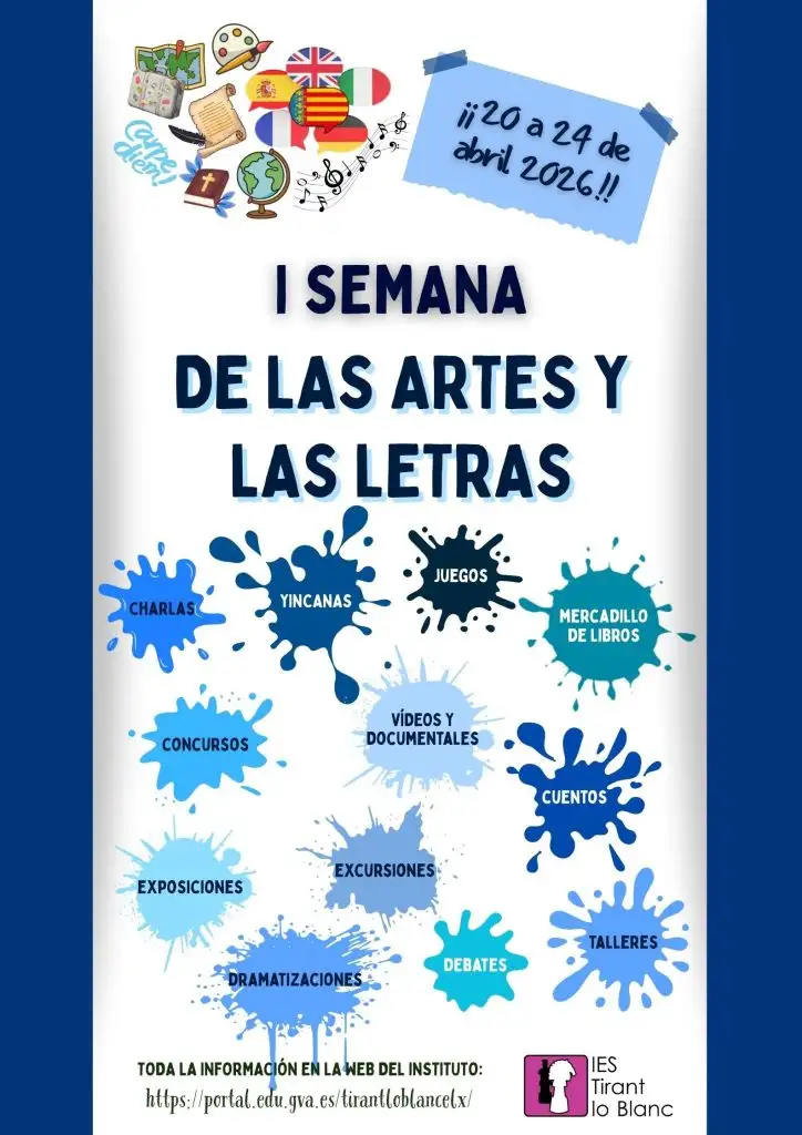 Tras el éxito de la I Semana de las Ciencias y la Tecnología, disciplinas como el turismo, el arte, las lenguas, la historia, la música o la religión toman el relevo para seguir con las Semanas temáticas del Tirant. ¡El próximo día 20 comienza la I Semana de las Artes y las Letras!! Aquí tenéis el programa: