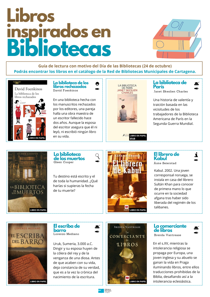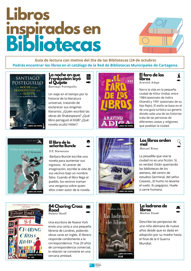 El 24 d’octubre se celebra a Espanya el Dia de les Biblioteques i la biblioteca Vicente Guinea del Tirant se suma a la iniciativa de la Xarxa de Biblioteques Municipals de Cartagena. Ací teniu alguns dels llibres que recomanen per a celebrar este dia. Quin preferiu? Nosaltres tenim el nostre preferit…