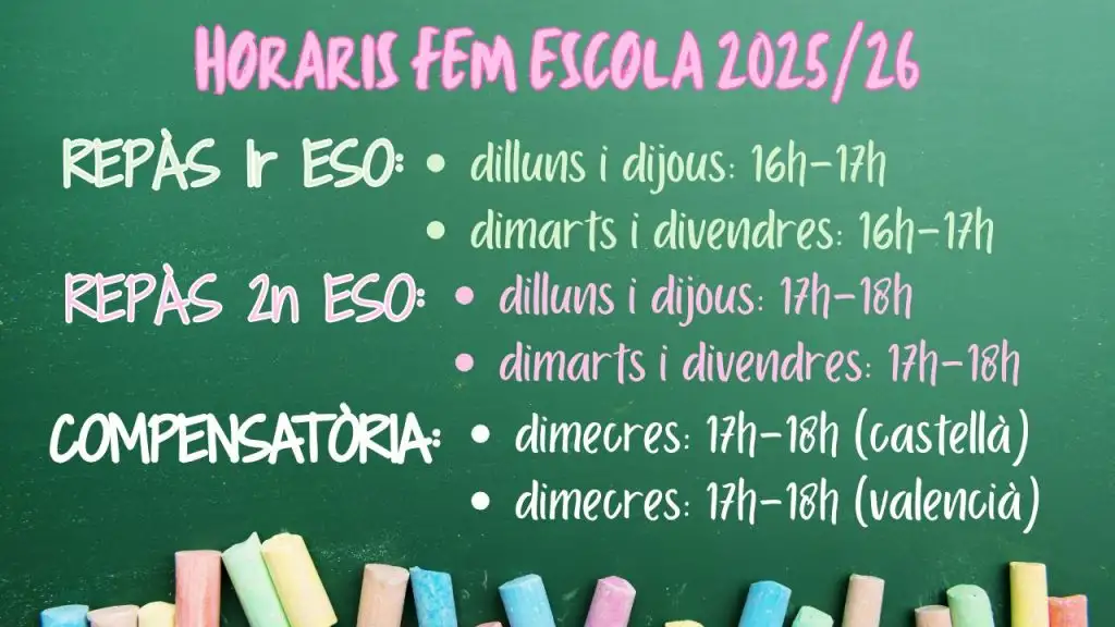 Cada any, els nostres xics de 1r i 2n ESO poden accedir a les classes de repàs o de compensatòria lingüística (castellà i/o valencià), totes gratuïtes i en horari de vesprades. Per a això, les famílies han de presentar la seua sol·licitud a través del formulari que troben en la Secretària del centre o en esta web (apartat Espai famílies – Informació important per a les famílies).