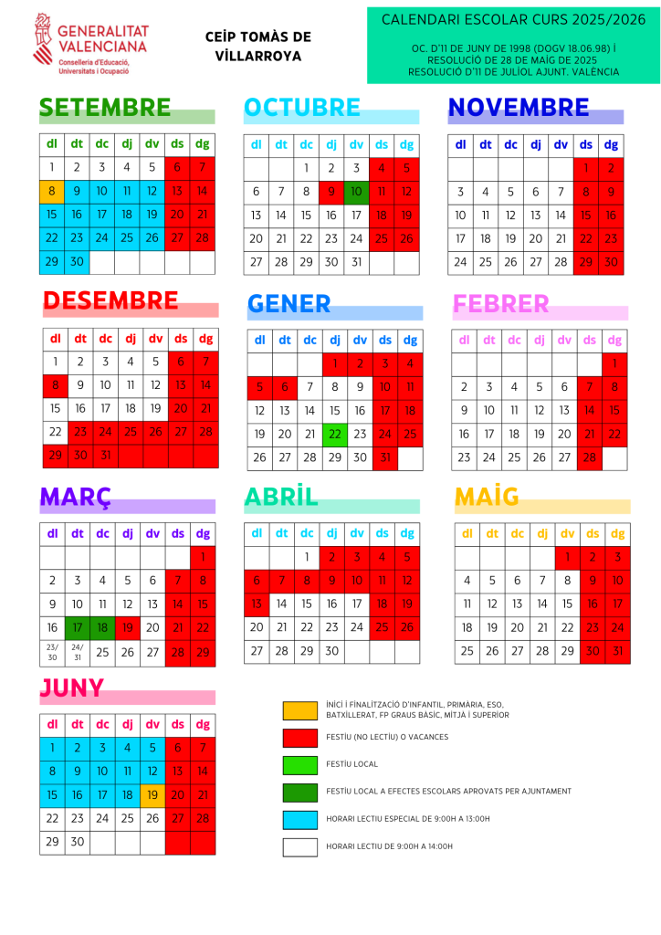 Podeu consultar el calendari escolar oficial a la RESOLUCIÓ de 28 de maig de 2025 (DOGV 03/06/2025)
