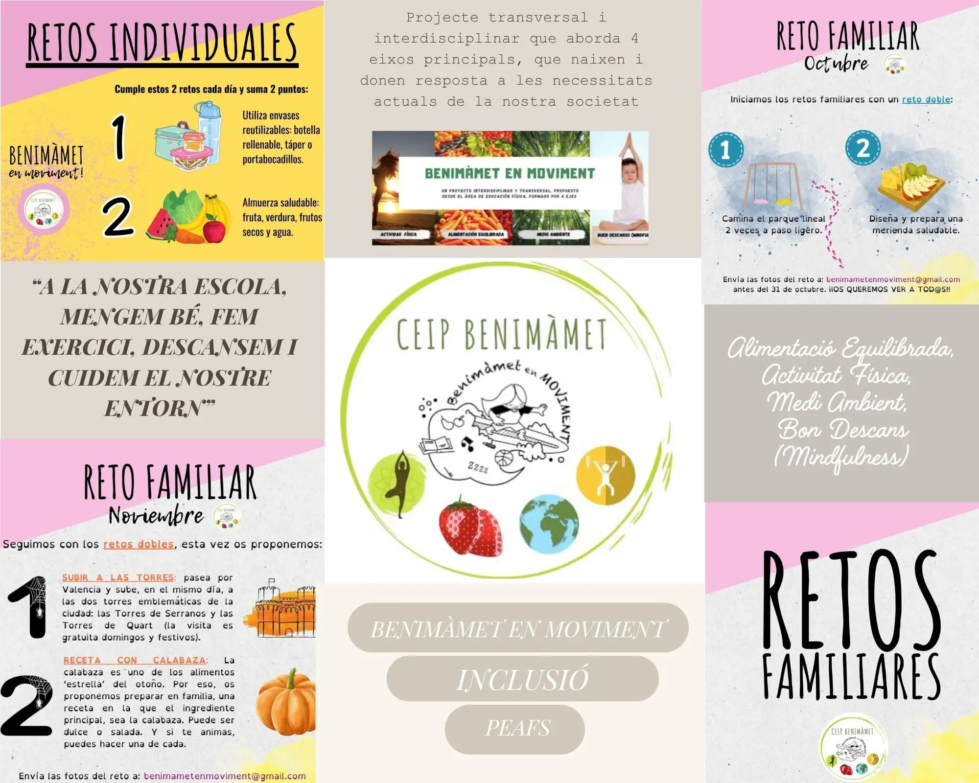 Proyecto multidisciplinar y transversal, que aborda los 4 ejes que dan respuesta a las necesidades de nuestra sociedad: alimentación equilibrada, actividad física, medio ambiente, buen descanso (mindfulness). Dirigido a toda la comunidad educativa mediante retos y varias propuestas.
