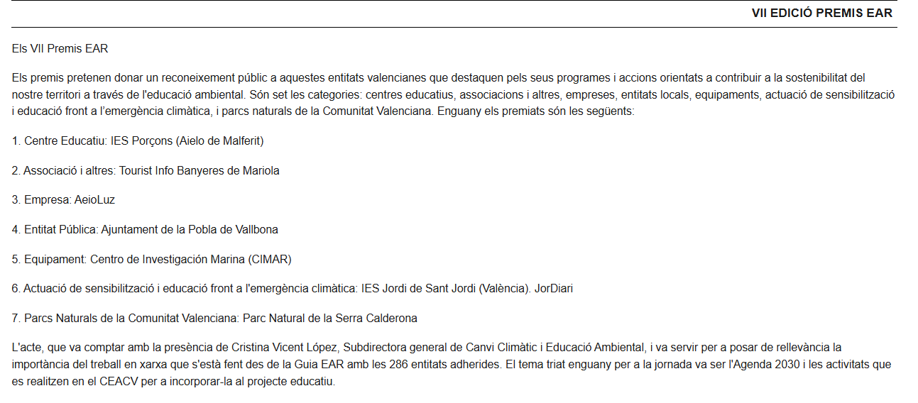 Reconocimientos recibidosVII PREMIO EAR: Centro Educativo IES Porçons (Aielo de Malferit)