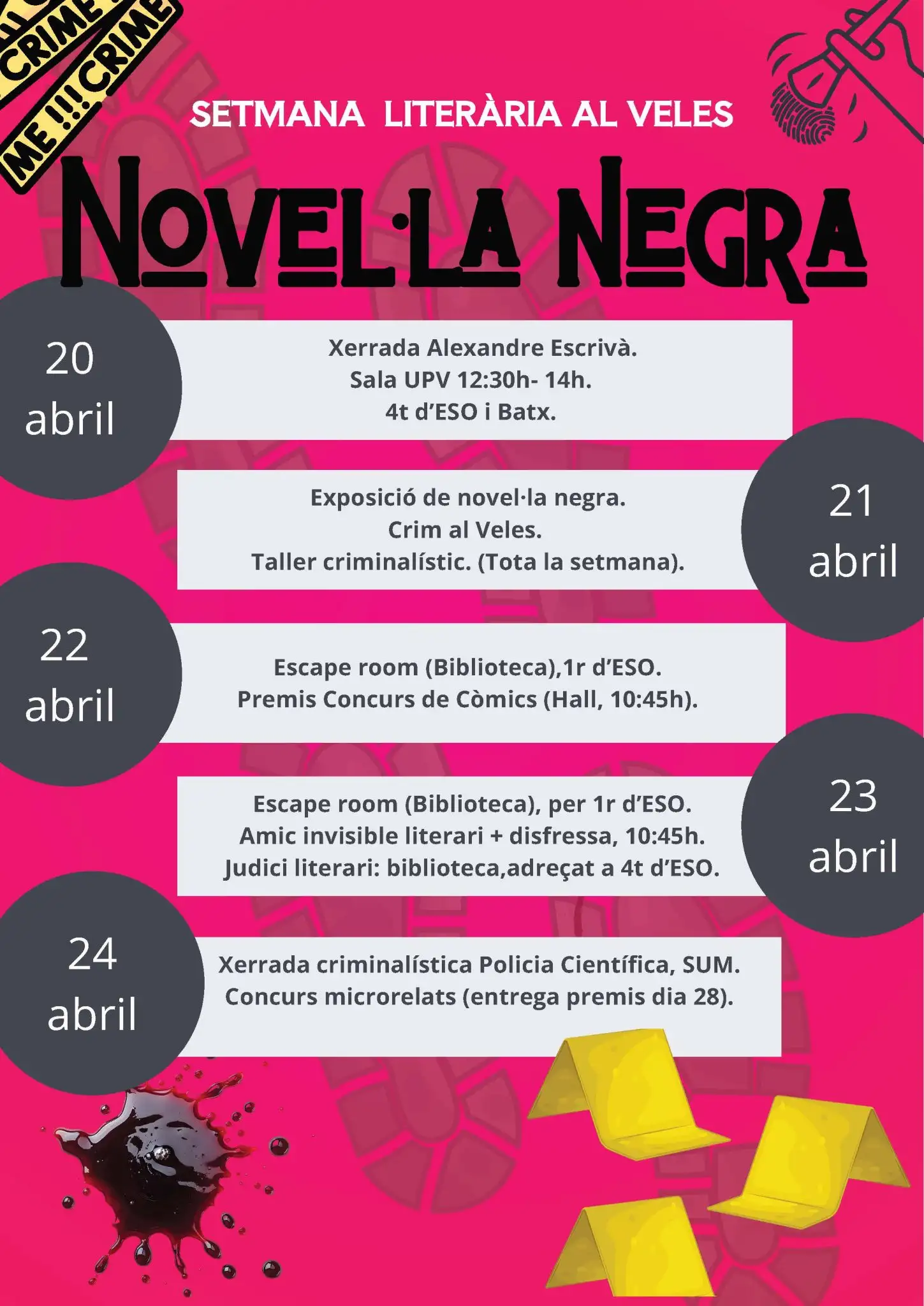 La setmana continua amb moltes més activitats: concurs de còmics, de microrelats, escape room, taller criminalístic, xerrada de la Policia Científica, “Crim al Veles”, exposició sobre novel·la negra, judici literari… I tot ambientat amb música i podcast per crear una atmosfera plena d’intriga i suspens que farà gaudir a tot el Veles.