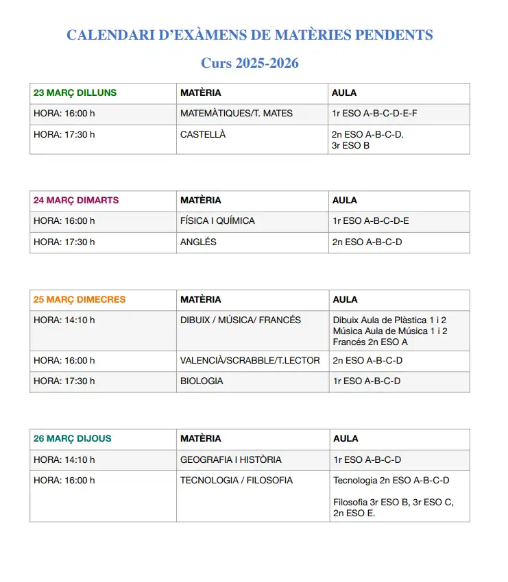 Adjuntem el calendari d’exàmens d’assignatures pendents d’ESO i batxillerat.