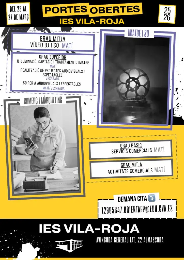 Del 23 al 27 de marzo, puertas abiertas de los ciclos formativos de FP del IEs Vila-roja. Pide cita al 12005647.orientafp@edu.gva.es