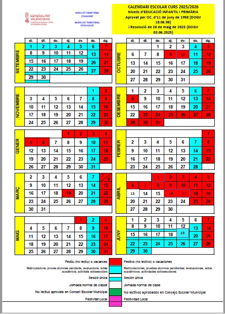 El curso escolar 2025/2026, para las etapas de Educación Infantil y Primaria, en la ciudad de Alicante empieza el día 8 de septiembre y acaba el día 18 de junio de 2026.